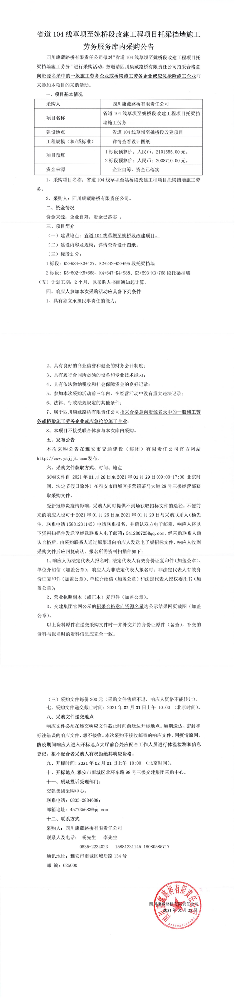四川康藏路橋有限責任公司省道104線草壩至姚橋段改建工程項目托梁擋墻施工勞務服務庫內采購公告