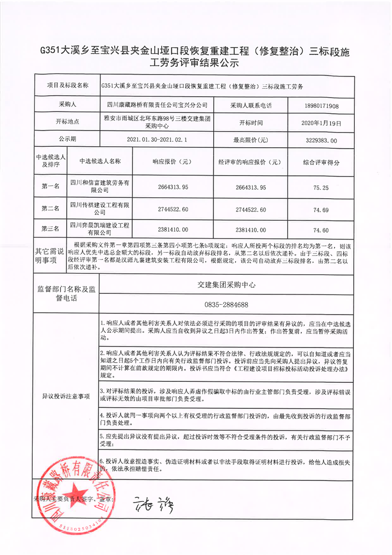 四川康藏路橋有限責(zé)任公司G351大溪鄉(xiāng)至寶興縣夾金山埡口段恢復(fù)重建工程(修復(fù)整治)三標(biāo)段施工勞務(wù)評(píng)審結(jié)果公示