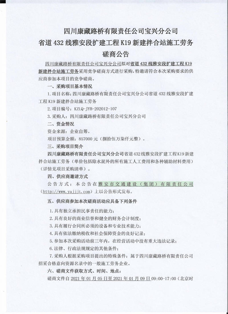 四川康藏路橋有限責任公司寶興分公司省道432線雅安段擴建工程K19新建拌合站施工勞務磋商公告
