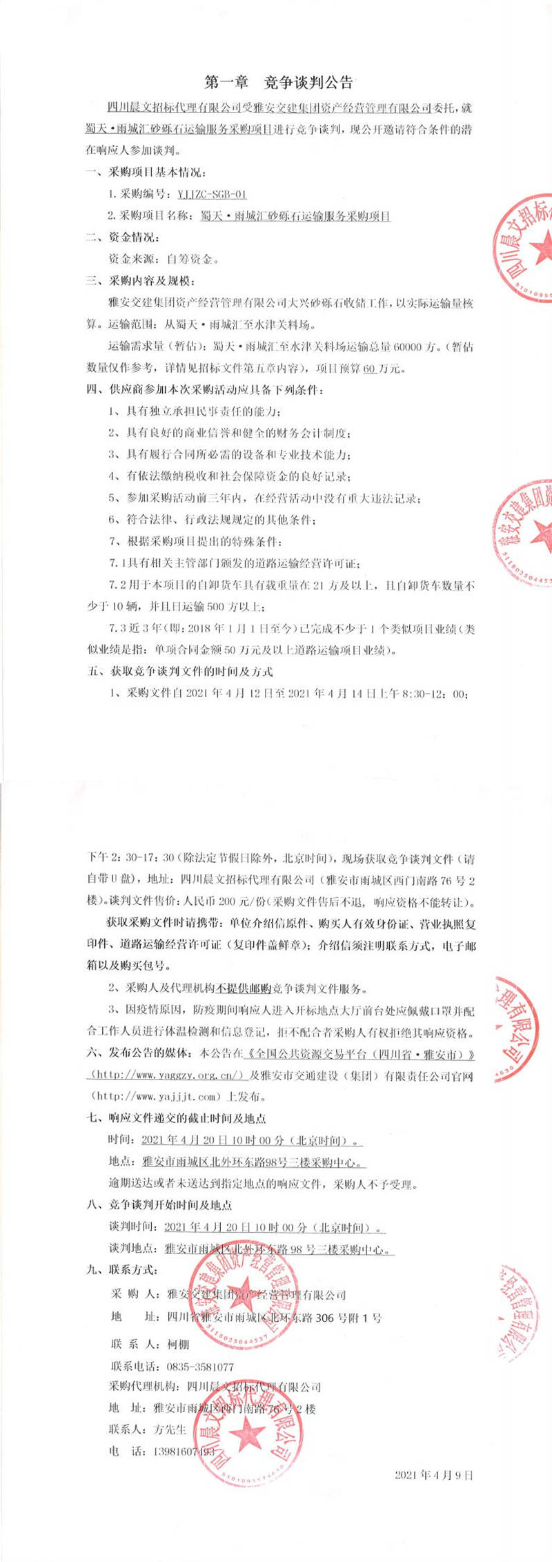 雅安交建集團資產(chǎn)經(jīng)營管理有限公司蜀天.雨城匯砂礫石運輸服務(wù)采購項目競爭談判公告