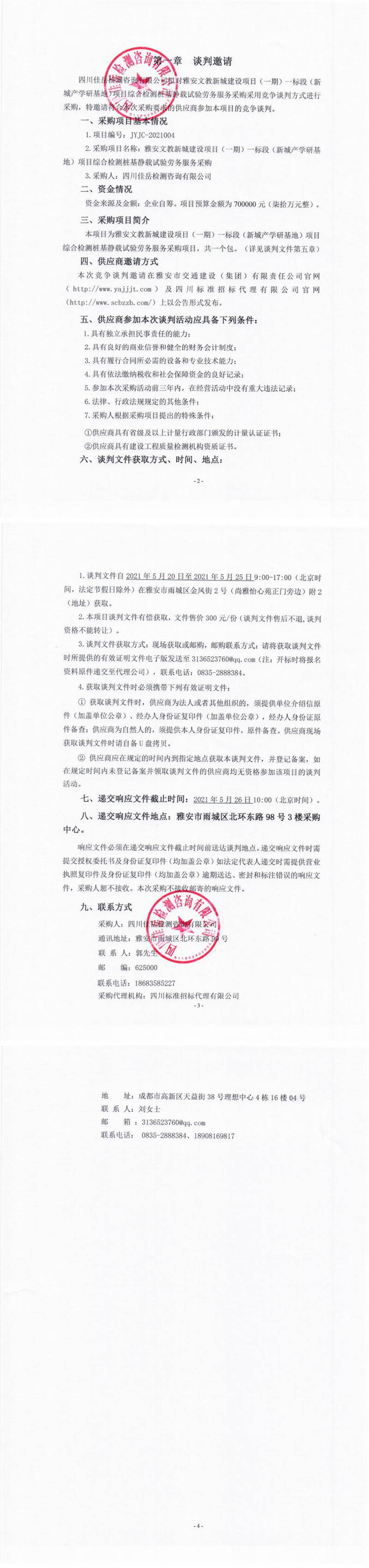 四川佳岳檢測咨詢有限公司雅安文教新城建設(shè)項(xiàng)目(一期)一標(biāo)段(新城產(chǎn)學(xué)研基地)項(xiàng)目綜合檢測樁基靜載試驗(yàn)勞務(wù)服務(wù)競爭談判公告