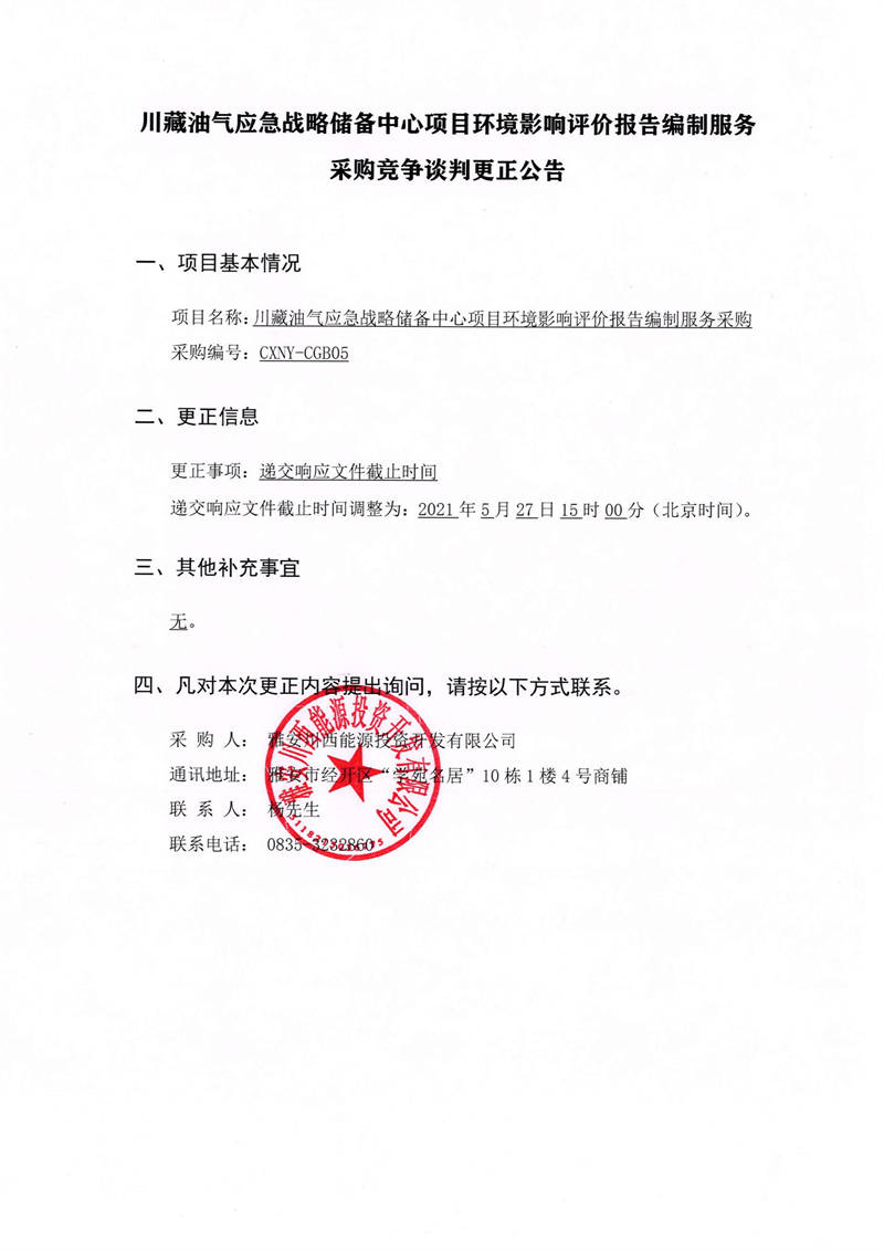 雅安川西能源投資開(kāi)發(fā)有限公司川藏油氣應(yīng)急戰(zhàn)略儲(chǔ)備中心項(xiàng)目環(huán)境影響評(píng)價(jià)報(bào)告編制服務(wù)采購(gòu)競(jìng)爭(zhēng)談判更正公告