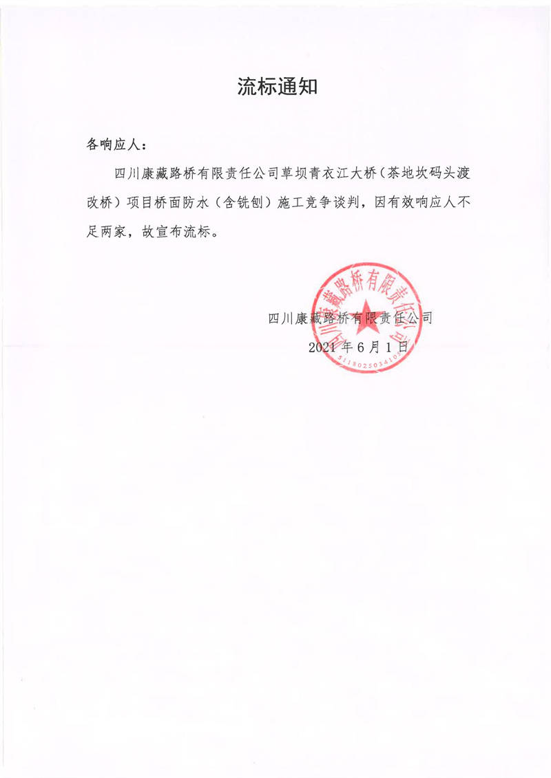 四川康藏路橋有限責任公司草壩青衣江大橋(茶地坎碼頭渡改橋)項目橋面防水(含銑刨)施工競爭談判流標通知