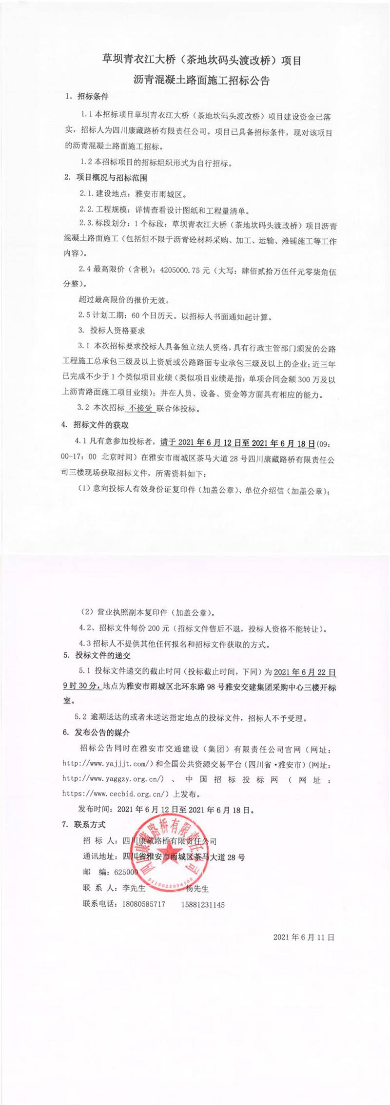 四川康藏路橋有限責(zé)任公司草壩青衣江大橋(茶地坎碼頭渡改橋)項目瀝青混凝土路面施工招標(biāo)公告