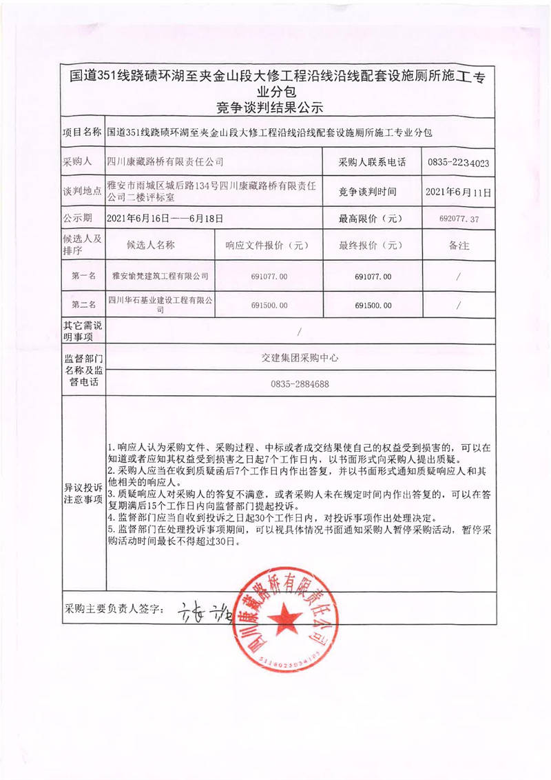 四川康藏路橋有限責任公司國道351線蹺磧環(huán)湖至夾金山段大修工程沿線沿線配套設施廁所施工專業(yè)分包競爭談判結果公示