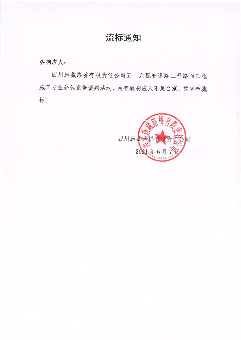 四川康藏路橋有限責(zé)任公司五二六配套道路工程路面工程施工專業(yè)分包競(jìng)爭(zhēng)談判流標(biāo)通知