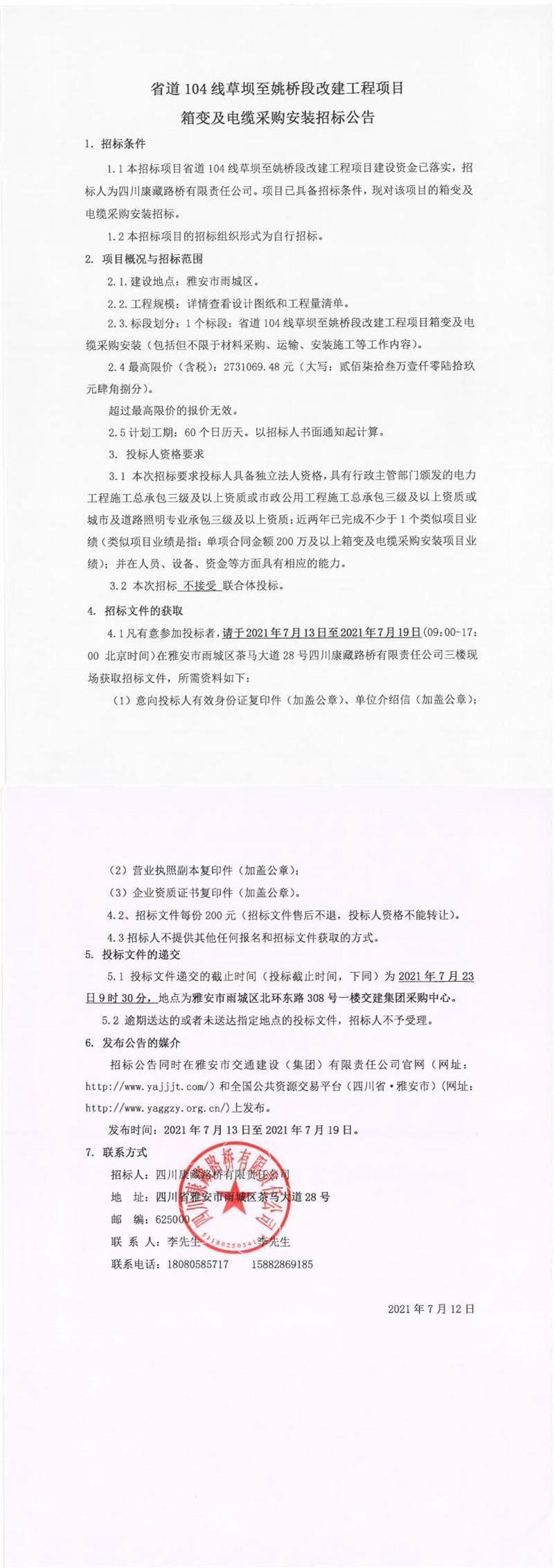 四川康藏路橋有限責(zé)任公司省道104線草壩至姚橋段改建項(xiàng)目箱變及電纜采購安裝招標(biāo)公告
