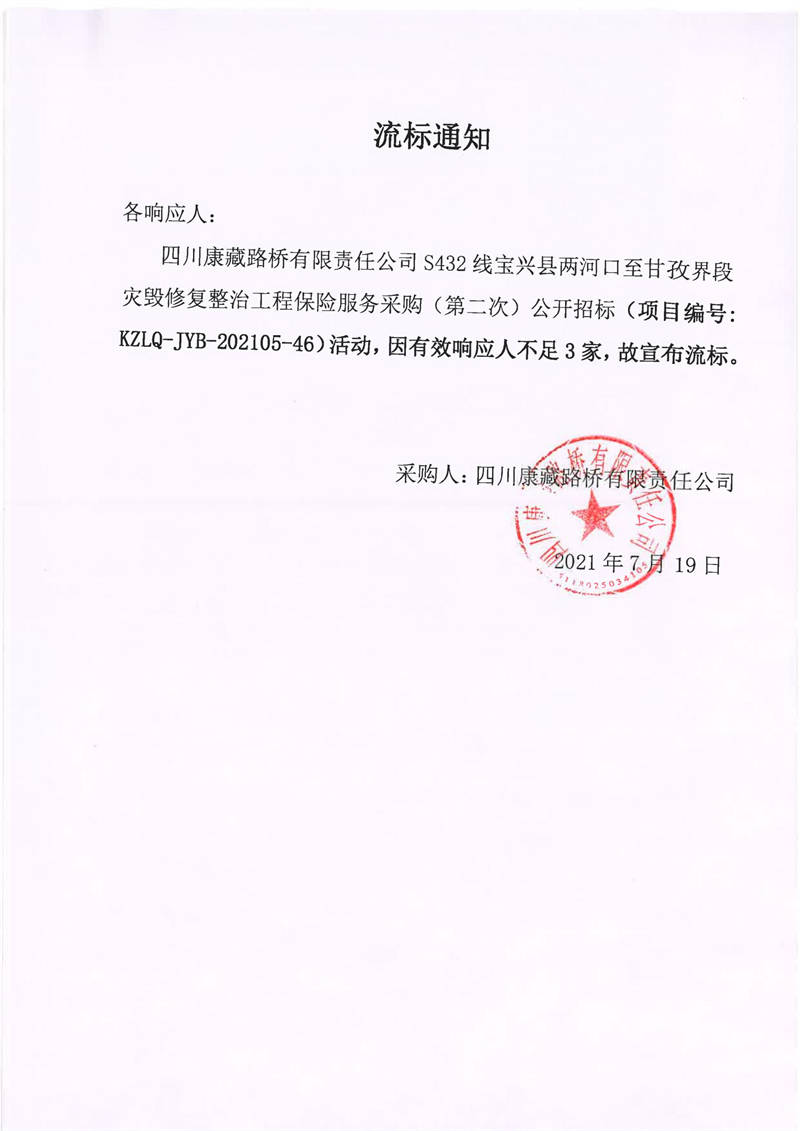 四川康藏路橋有限責(zé)任公司S432線寶興縣兩河口至甘孜界段災(zāi)毀修復(fù)整治工程保險(xiǎn)服務(wù)采購(gòu)(第二次)流標(biāo)通知