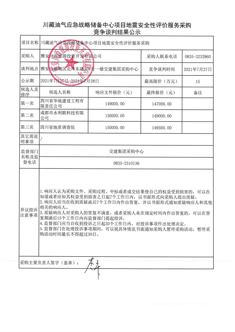 雅安川西能源投資開(kāi)發(fā)有限公司川藏油氣應(yīng)急戰(zhàn)略儲(chǔ)備中心項(xiàng)目地震安全性評(píng)價(jià)服務(wù)采購(gòu)競(jìng)爭(zhēng)談判結(jié)果公示