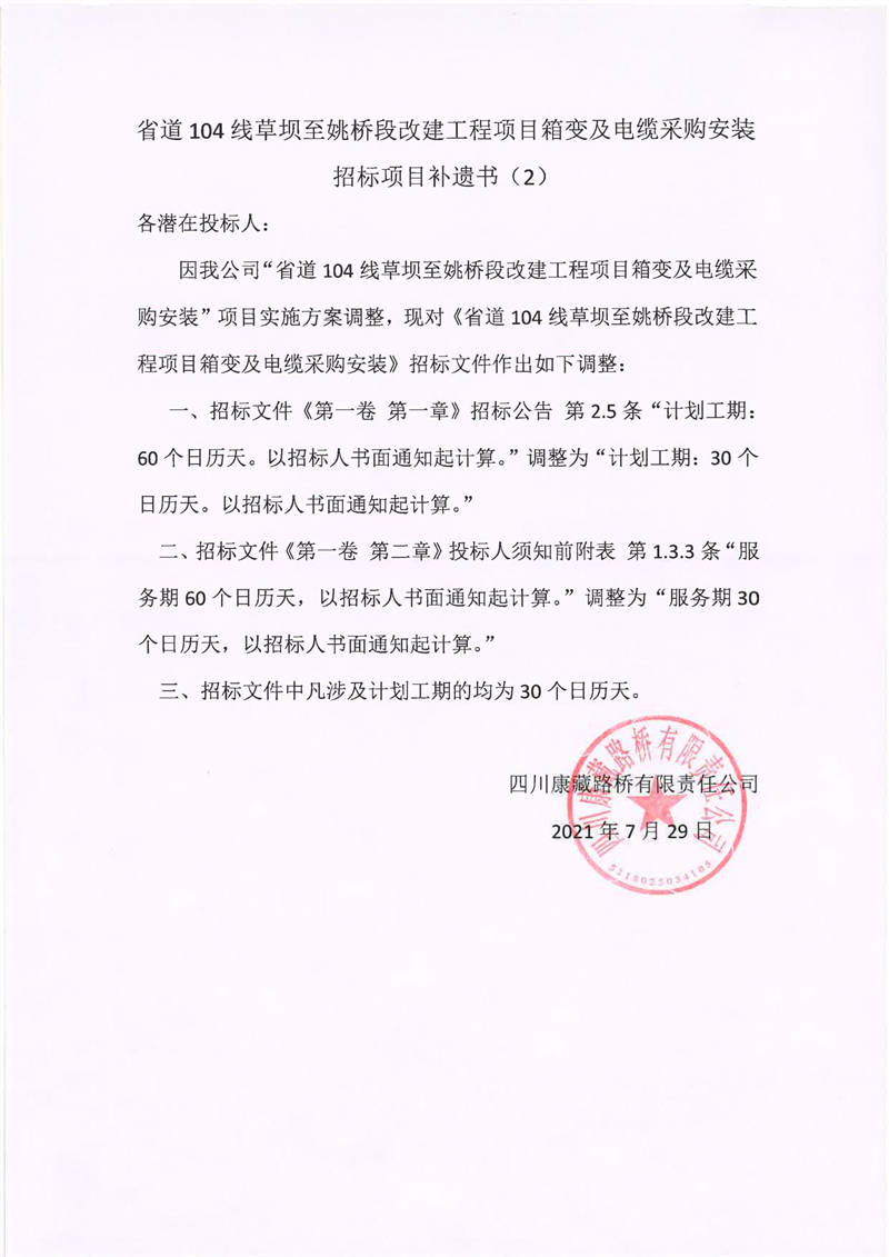四川康藏路橋有限責(zé)任公司省道104線草壩至姚橋段改建項(xiàng)目箱變及電纜采購(gòu)安裝招標(biāo)項(xiàng)目補(bǔ)遺書(shū)(2)