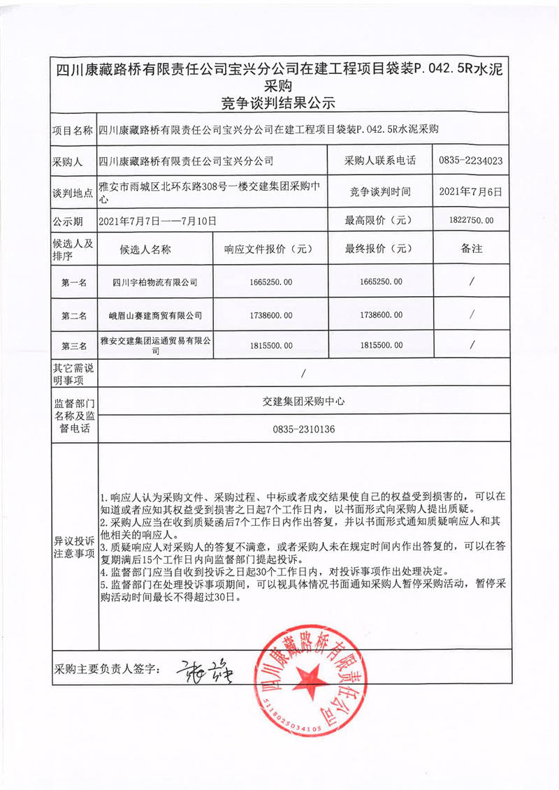 四川康藏路橋有限責(zé)任公司寶興分公司在建工程項(xiàng)目袋裝P.042.5R水泥采購競(jìng)爭(zhēng)談判結(jié)果公示