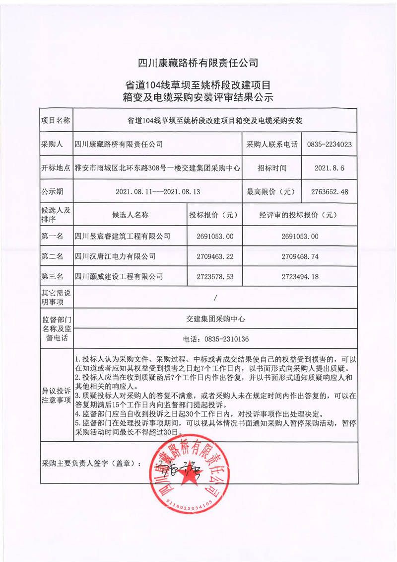 四川康藏路橋有限責任公司省道104線草壩至姚橋段改建項目箱變及電纜采購安裝評審結果公示