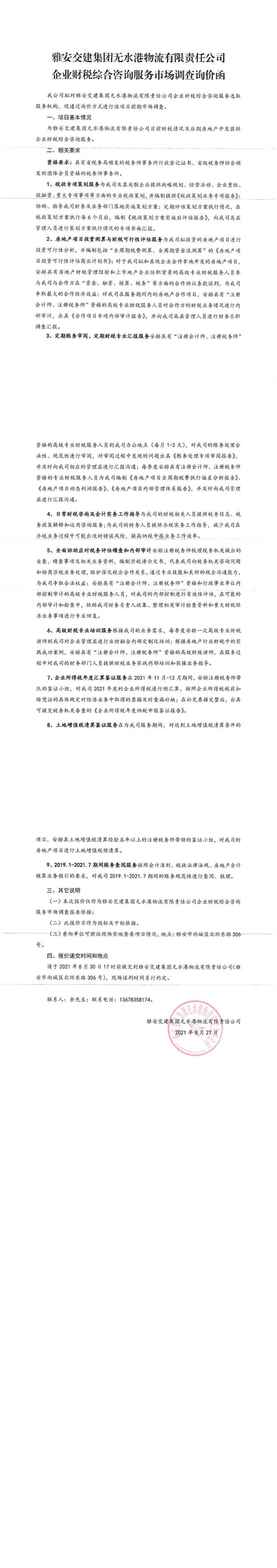 雅安交建集團無水港物流有限責任公司企業(yè)財稅綜合咨詢服務(wù)市場調(diào)查詢價函