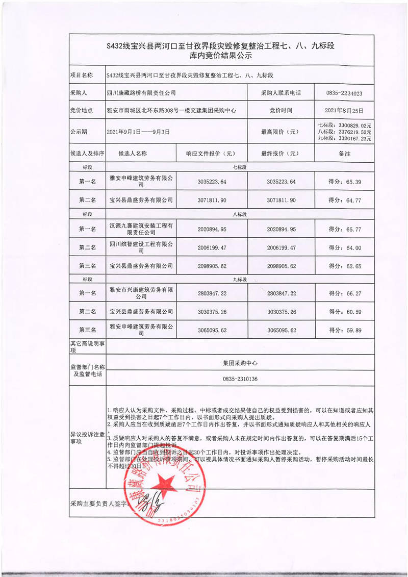 四川康藏路橋有限責(zé)任公司S432線寶興縣兩河口至甘孜界段災(zāi)毀修復(fù)整治工程七、八、九標(biāo)段庫內(nèi)競價結(jié)果公示