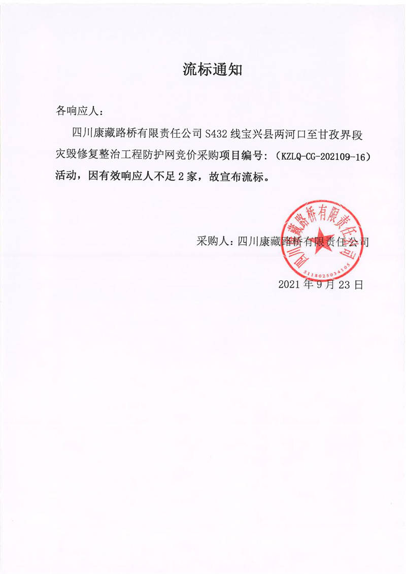 四川康藏路橋有限責(zé)任公司S432線寶興縣兩河口至甘孜界段災(zāi)毀修復(fù)整治工程防護(hù)網(wǎng)采購流標(biāo)通知