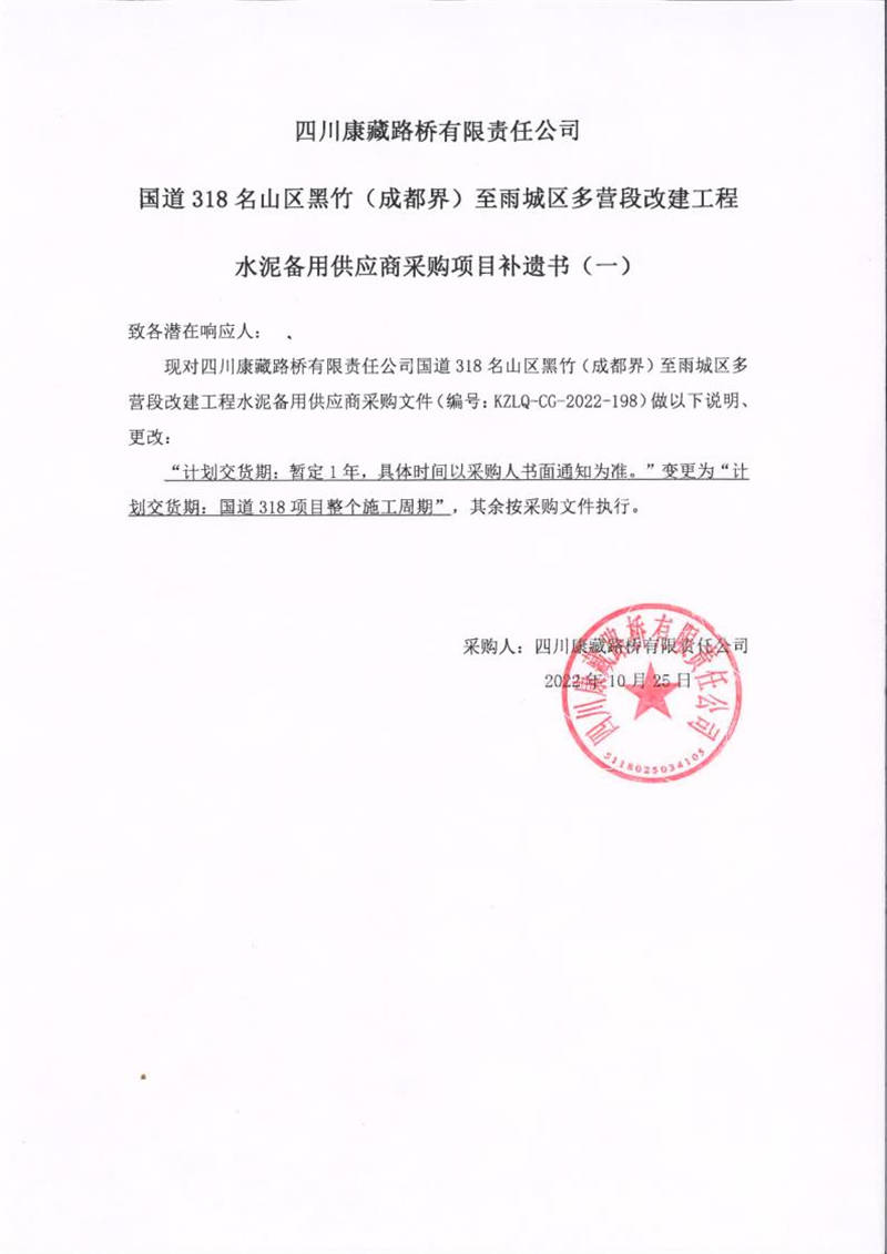 四川康藏路橋有限責(zé)任公司國(guó)道318名山區(qū)黑竹(成都界)至雨城區(qū)多營(yíng)段改建工程水泥備用供應(yīng)商采購(gòu)項(xiàng)目補(bǔ)遺書(shū)(一)