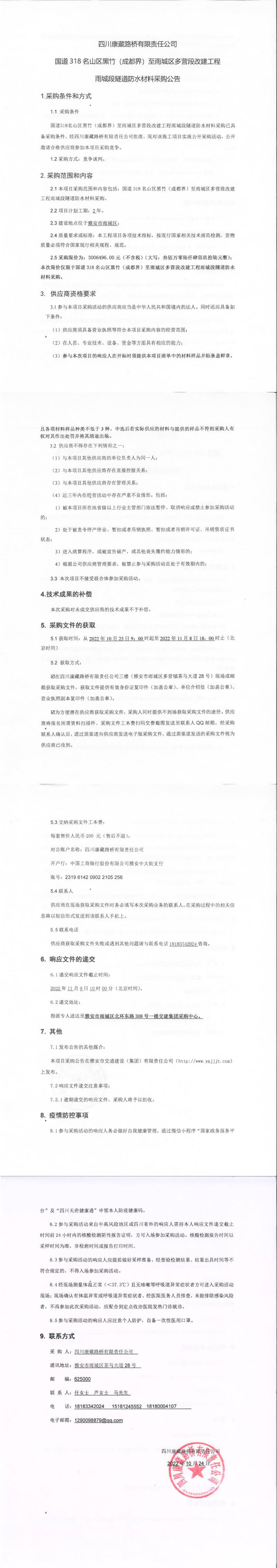 四川康藏路橋有限責(zé)任公司國(guó)道318名山區(qū)黑竹(成都界)至雨城區(qū)多營(yíng)段改建工程雨城段隧道防水材料采購(gòu)公告