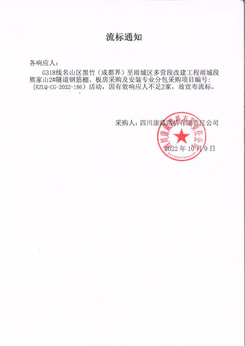 四川康藏路橋有限責任公司G318線名山區(qū)黑竹(成都界)至雨城區(qū)多營段改建工程雨城段熊家山2#隧道鋼筋棚、板房采購及安裝專業(yè)分包采購項目流標通知