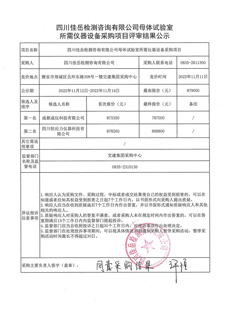 四川佳岳檢測咨詢有限公司母體試驗室所需儀器設備采購項目評審結果公示
