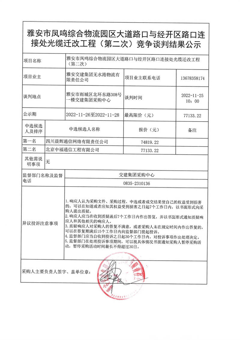 雅安交建集團無水港物流有限責任公司雅安市鳳鳴綜合物流園區(qū)大道路口與經(jīng)開區(qū)路口連接處光纜遷改工程(第二次)競爭談判結(jié)果公示