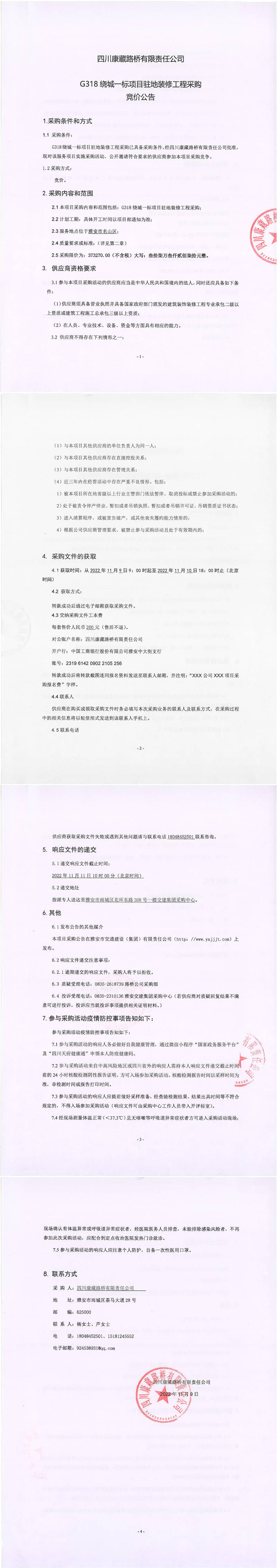 四川康藏路橋有限責任公司G318繞城一標項目駐地裝修工程采購競價公告