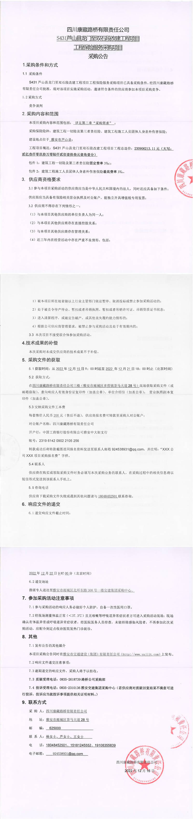 四川康藏路橋有限責任公司S431蘆山縣龍門至雙石段改建工程項目工程保險服務采購項目采購公告
