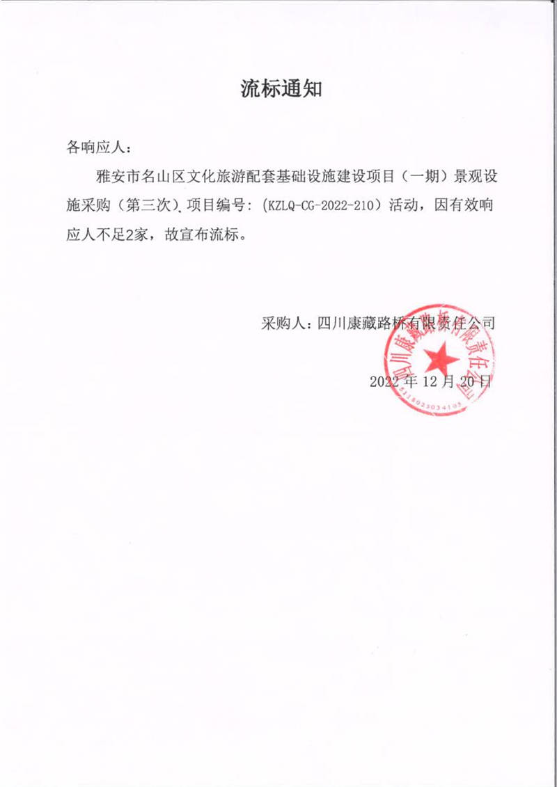 四川康藏路橋有限責任公司雅安市名山區(qū)文化旅游配套基礎設施建設項目(一期)景觀設施采購(第三次)流標通知