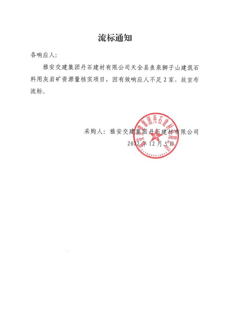 雅安交建集團(tuán)丹石建材有限公司天全縣魚泉獅子山建筑石料用灰?guī)r礦資源量核實(shí)項(xiàng)目流標(biāo)通知