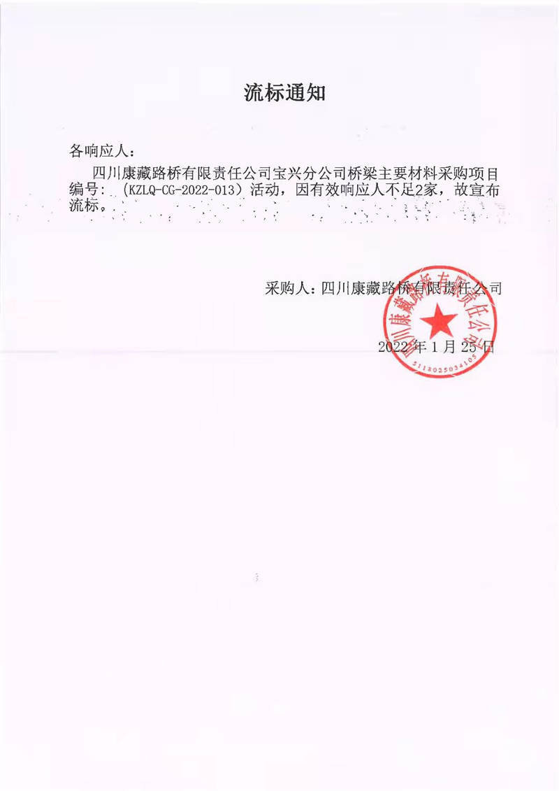 四川康藏路橋有限責(zé)任公司寶興分公司橋梁主要材料采購項(xiàng)目流標(biāo)通知