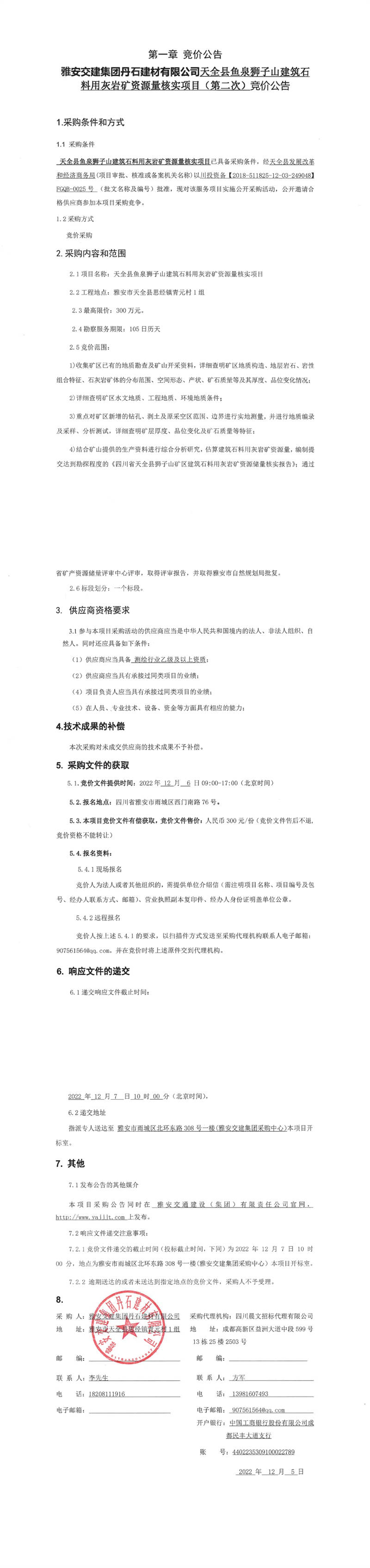 雅安交建集團(tuán)丹石建材有限公司天全縣魚(yú)泉獅子山建筑石料用灰?guī)r礦資源量核實(shí)項(xiàng)目(第二次)競(jìng)價(jià)公告