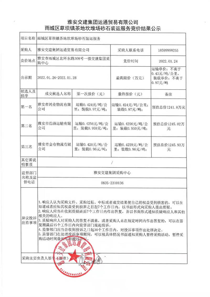 雅安交建集團(tuán)運(yùn)通貿(mào)易有限公司雨城區(qū)草壩鎮(zhèn)茶地坎堆場(chǎng)砂石裝運(yùn)服務(wù)競(jìng)價(jià)結(jié)果公示