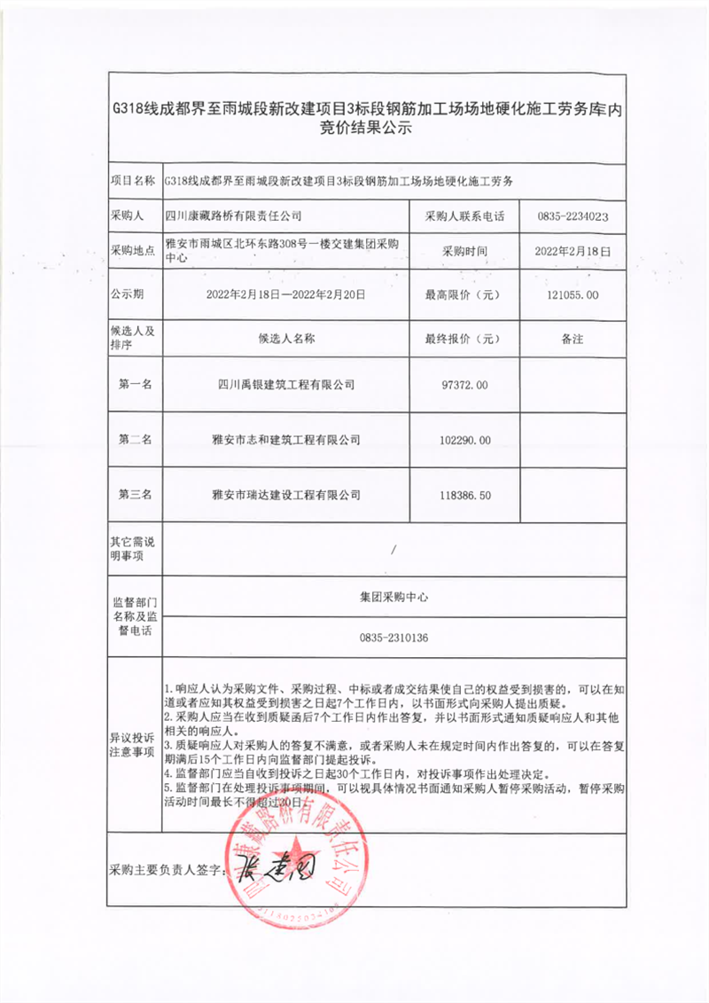 四川康藏路橋有限責(zé)任公司G318線(xiàn)成都界至雨城段新改建項(xiàng)目3標(biāo)段鋼筋加工場(chǎng)場(chǎng)地硬化施工勞務(wù)庫(kù)內(nèi)競(jìng)價(jià)結(jié)果公示