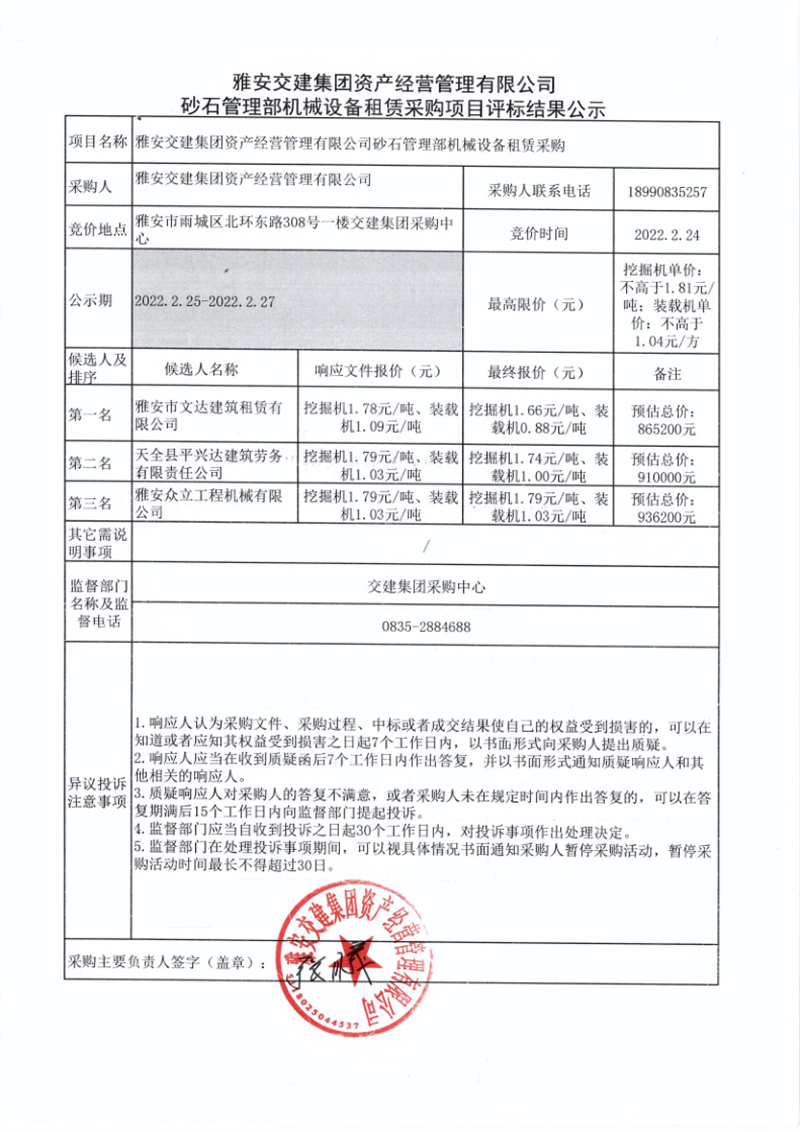 雅安交建集團(tuán)資產(chǎn)經(jīng)營管理有限公司砂石管理部機(jī)械設(shè)備租賃采購項目評標(biāo)結(jié)果公示