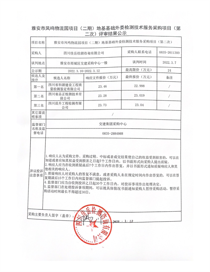 四川佳岳檢測咨詢有限公司雅安市鳳鳴物流園項(xiàng)目(二期)地基基礎(chǔ)外委檢測技術(shù)服務(wù)采購項(xiàng)目(第二次)評(píng)審結(jié)果公示