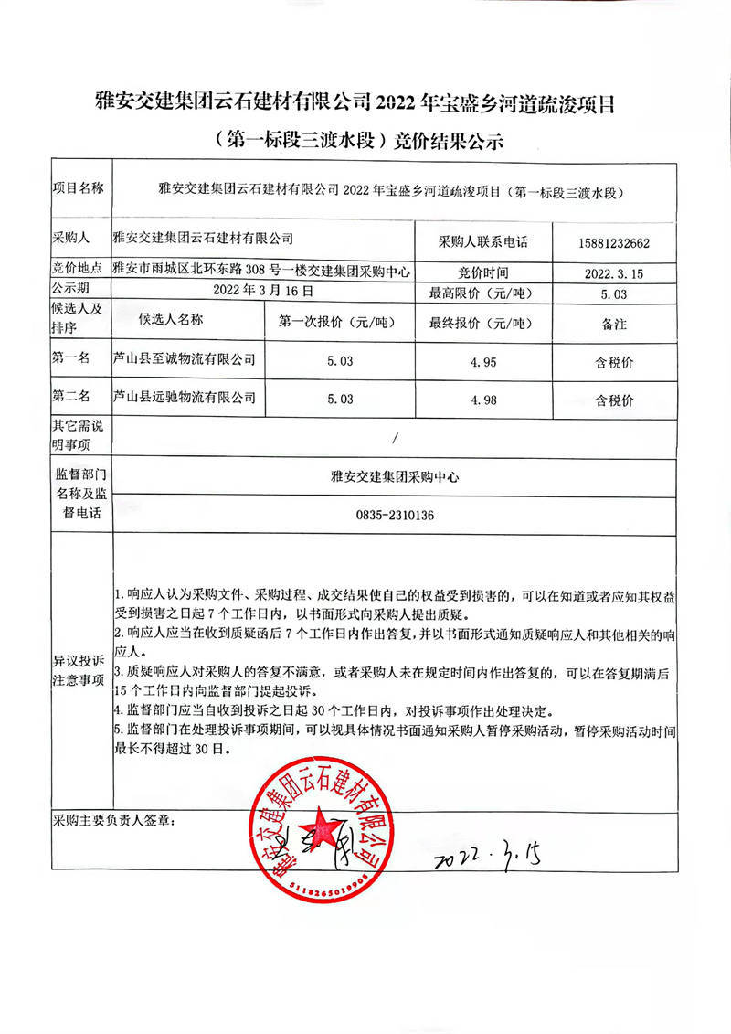 雅安交建集團(tuán)云石建材有限公司2022年寶盛鄉(xiāng)河道疏浚項(xiàng)目(第二標(biāo)段紙廠頭段)競價結(jié)果公示