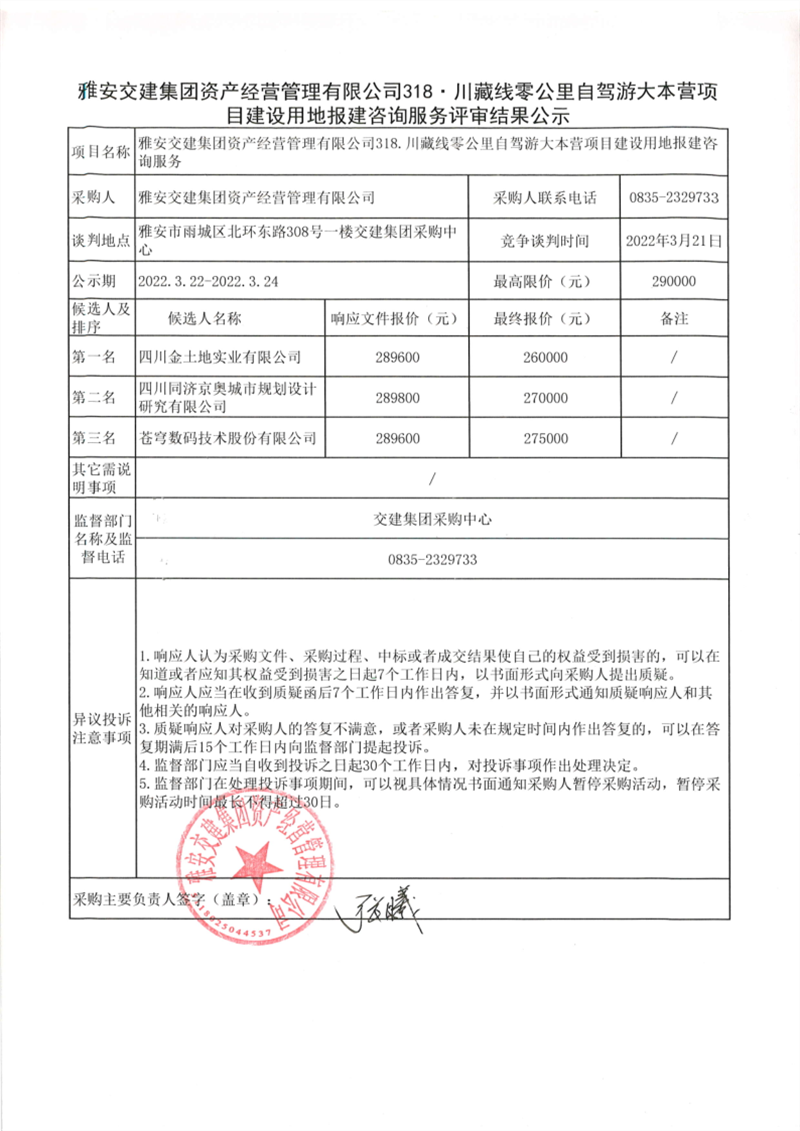 雅安交建集團(tuán)資產(chǎn)經(jīng)營管理有限公司318川藏線零公里自駕游大本營項(xiàng)目建設(shè)用地報(bào)建咨詢服務(wù)評(píng)審結(jié)果公示