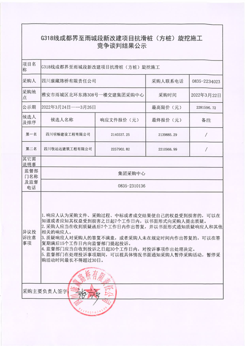 四川康藏路橋有限責(zé)任公司G318線成都界至雨城段新改建項(xiàng)目抗滑樁(方樁)旋挖施工競爭談判結(jié)果公示