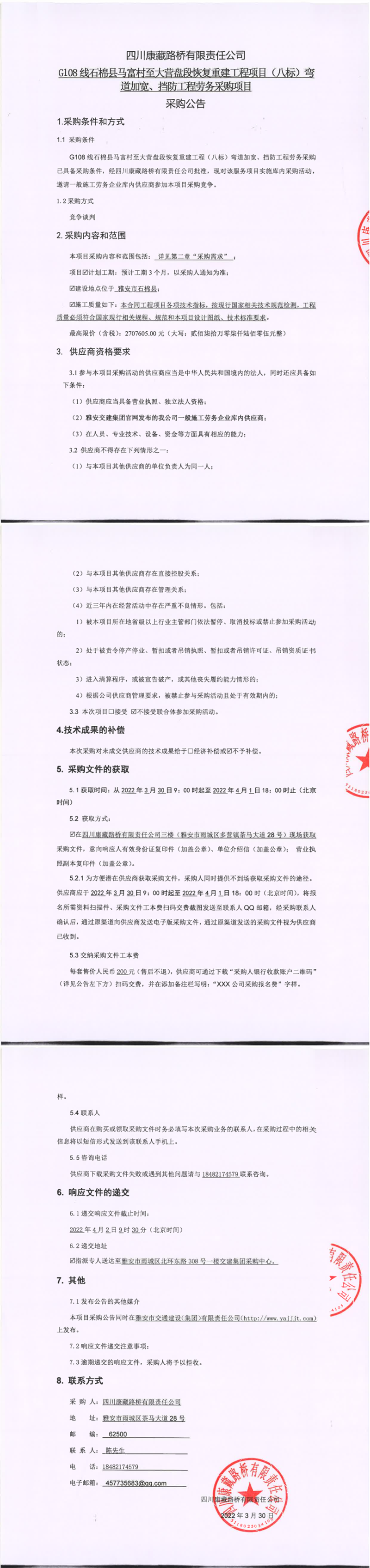 四川康藏路橋有限責任公司G108線石棉縣馬富村至大營盤段恢復重建工程(八標)彎道加寬、擋防工程勞務采購項目采購公告
