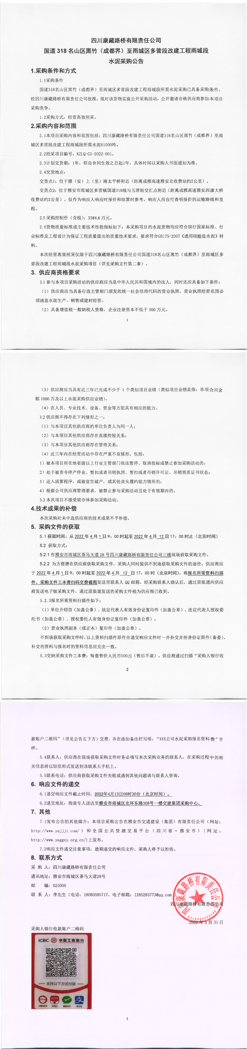 四川康藏路橋有限責任公司國道318名山區(qū)黑竹(成都界)至雨城區(qū)多營段改建工程雨城段水泥采購公告