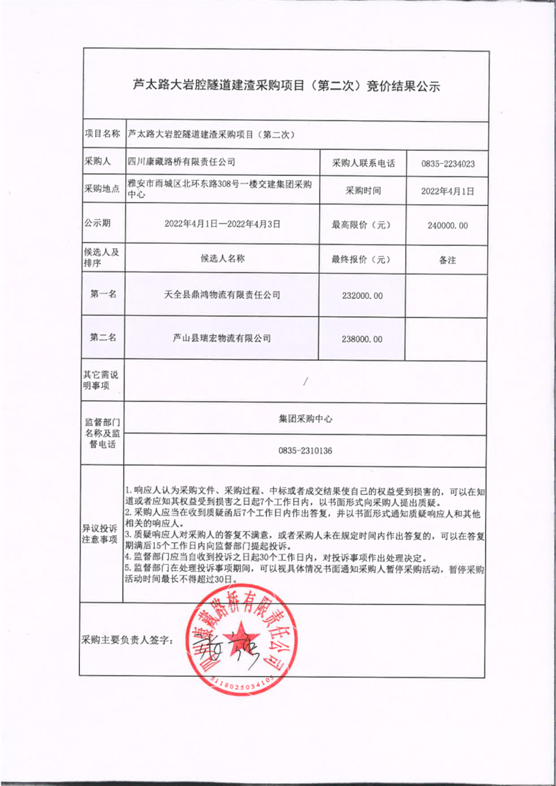 四川康藏路橋有限責任公司蘆太路大巖腔隧道建渣采購項目(第二次)競價結(jié)果公示