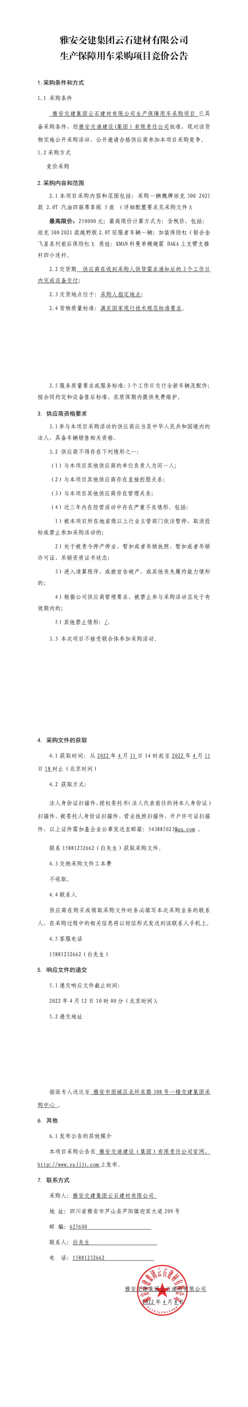 雅安交建集團(tuán)云石建材有限公司生產(chǎn)保障用車采購項(xiàng)目競(jìng)價(jià)公告