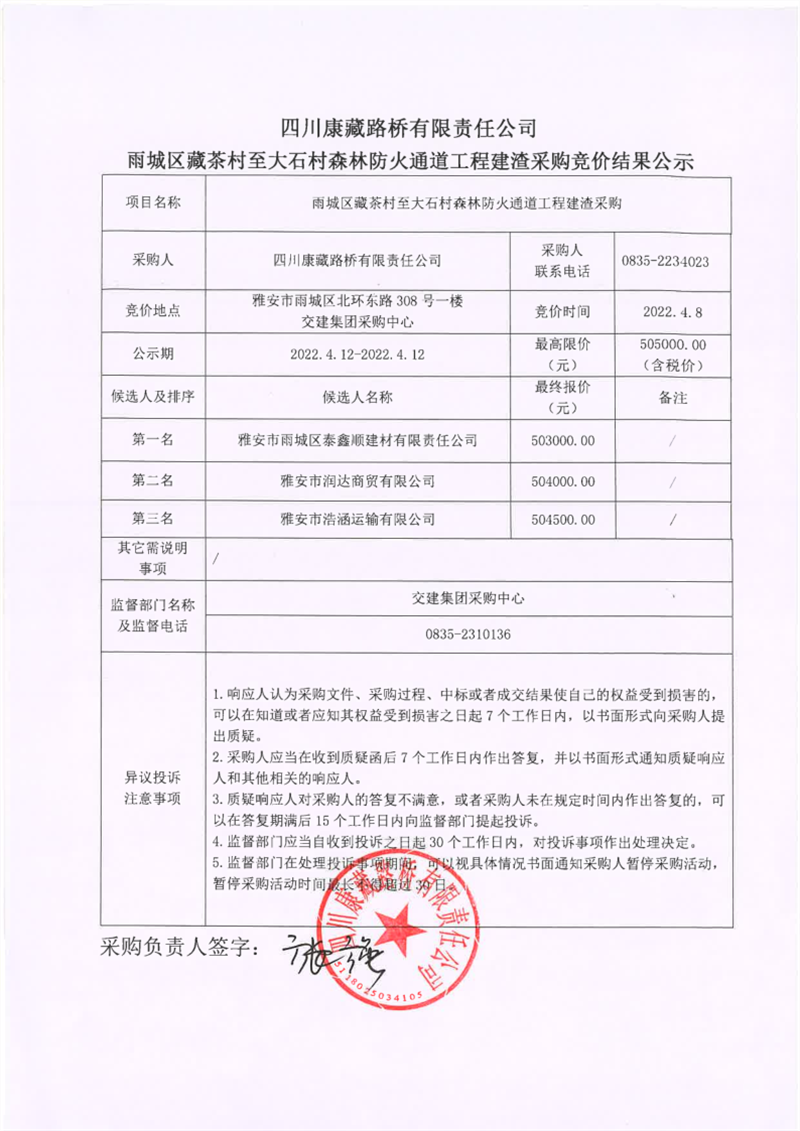 四川康藏路橋有限責(zé)任公司雨城區(qū)藏茶村至大石村森林防火通道工程建渣采購(gòu)競(jìng)價(jià)結(jié)果公示