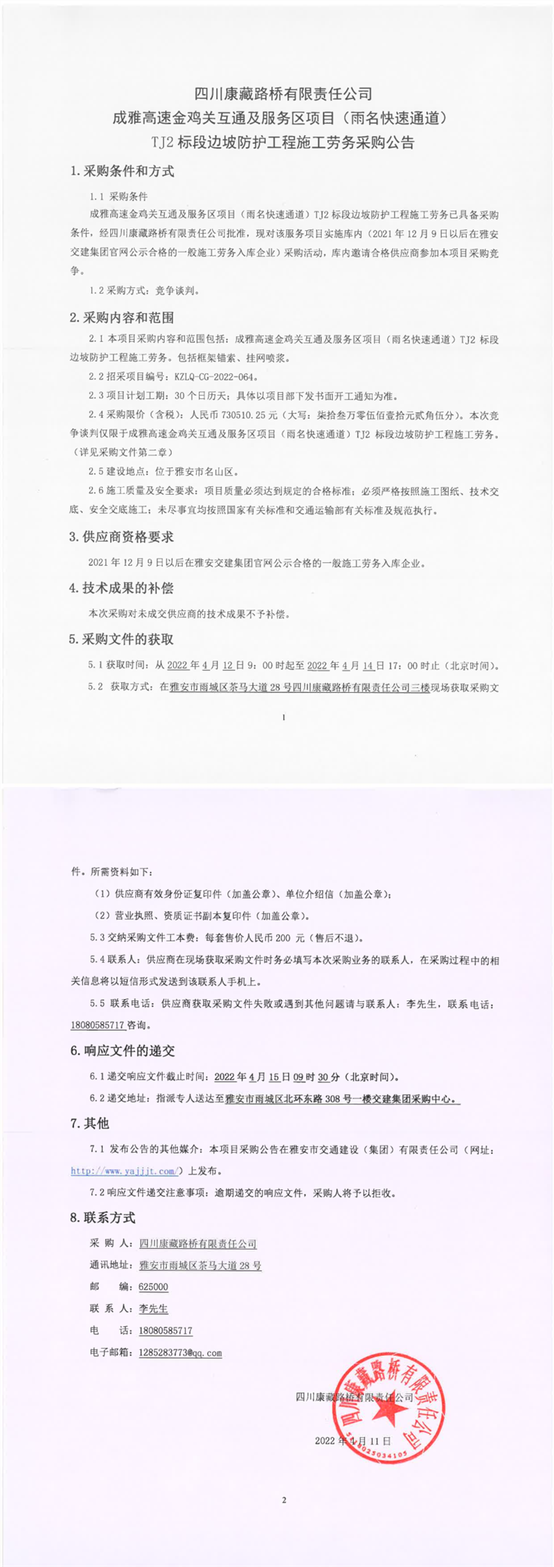 四川康藏路橋有限責(zé)任公司成雅高速金雞關(guān)互通及服務(wù)區(qū)項目(雨名快速通道)TJ2標(biāo)段邊坡防護(hù)工程施工勞務(wù)采購公告