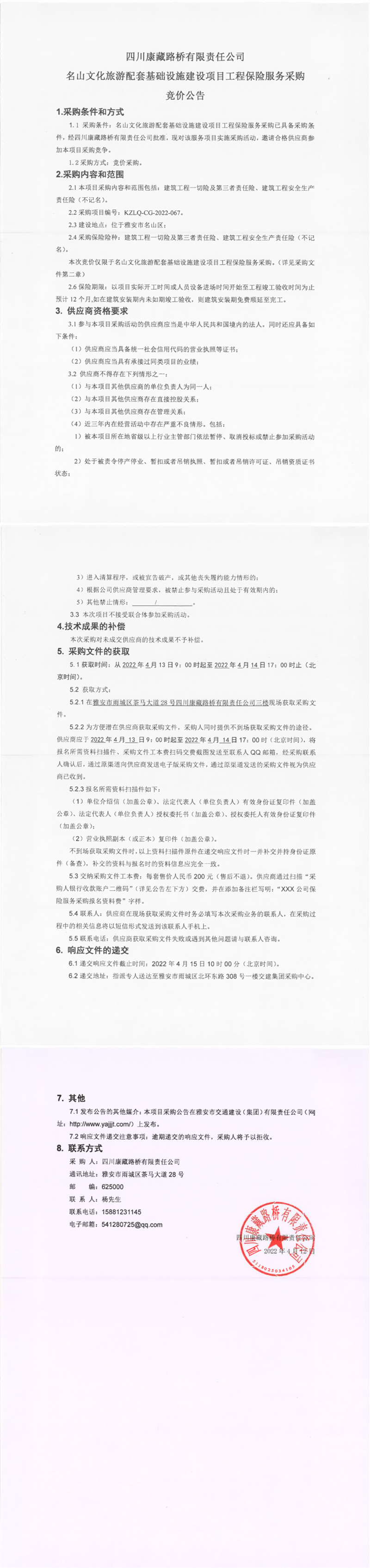 四川康藏路橋有限責(zé)任公司名山文化旅游配套基礎(chǔ)設(shè)施建設(shè)項(xiàng)目工程保險(xiǎn)服務(wù)采購競(jìng)價(jià)公告