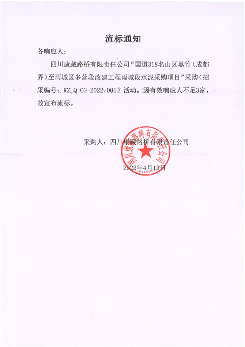 四川康藏路橋有限責任公司國道318名山區(qū)黑竹(成都界)至雨城區(qū)多營段改建工程雨城段水泥采購項目流標通知