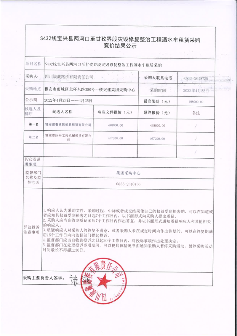 四川康藏路橋有限責任公司S432線寶興縣兩河口至甘孜界段災(zāi)毀修復(fù)整治工程灑水車租賃采購競價結(jié)果公示