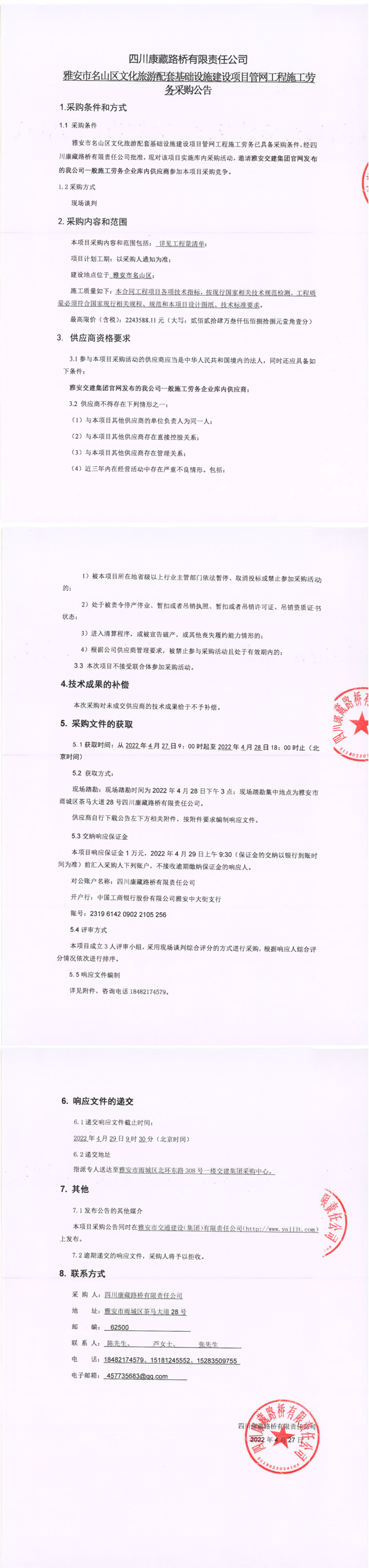 四川康藏路橋有限責(zé)任公司雅安市名山區(qū)文化旅游配套基礎(chǔ)設(shè)施建設(shè)項目管網(wǎng)工程施工勞務(wù)采購公告