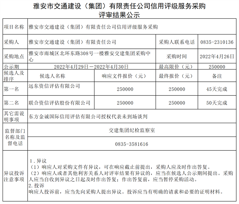 雅安市交通建設(集團)有限責任公司信用評級服務采購評審結(jié)果公示