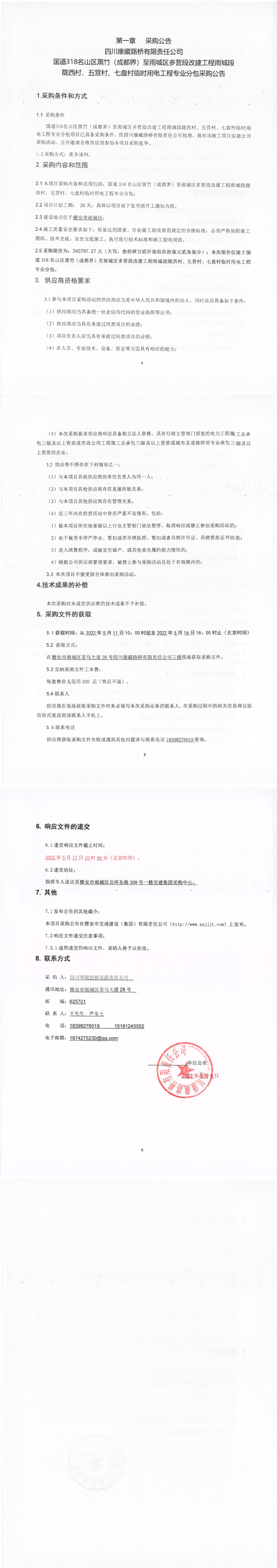 四川康藏路橋有限責(zé)任公司國道318名山區(qū)黑竹(成都界)至雨城區(qū)多營段改建工程雨城段隴西材、五營村、七盤村臨時(shí)用電工程專業(yè)分包采購公告