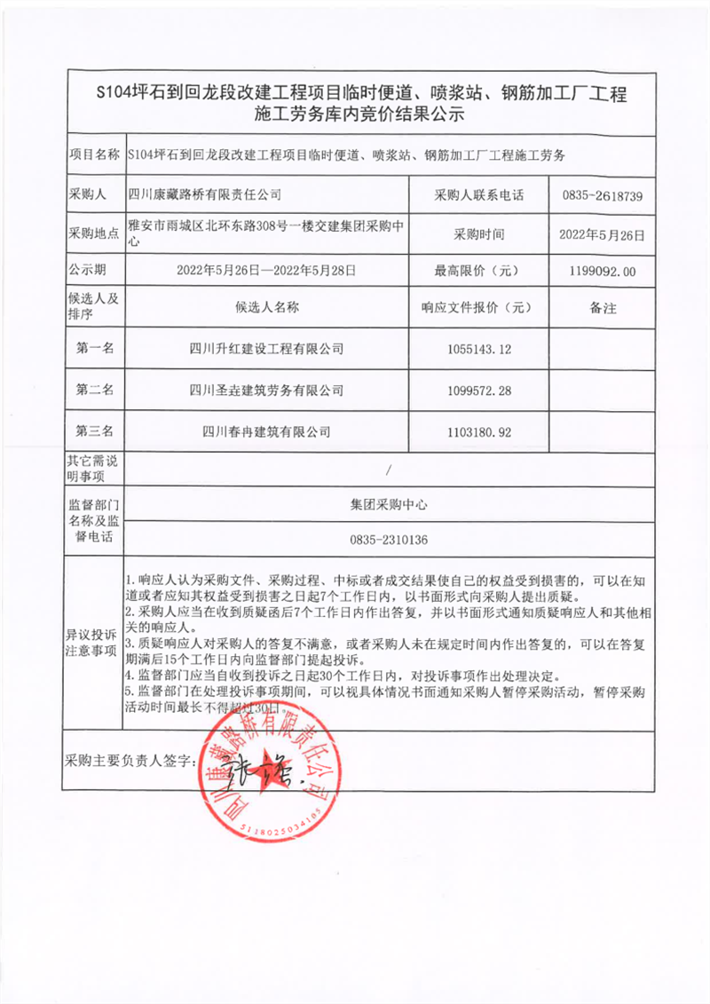 四川康藏路橋有限責任公司S104坪石到回龍改建工程項目臨時便道、噴漿站、鋼筋加工廠工程施工勞務(wù)庫內(nèi)競價結(jié)果公示